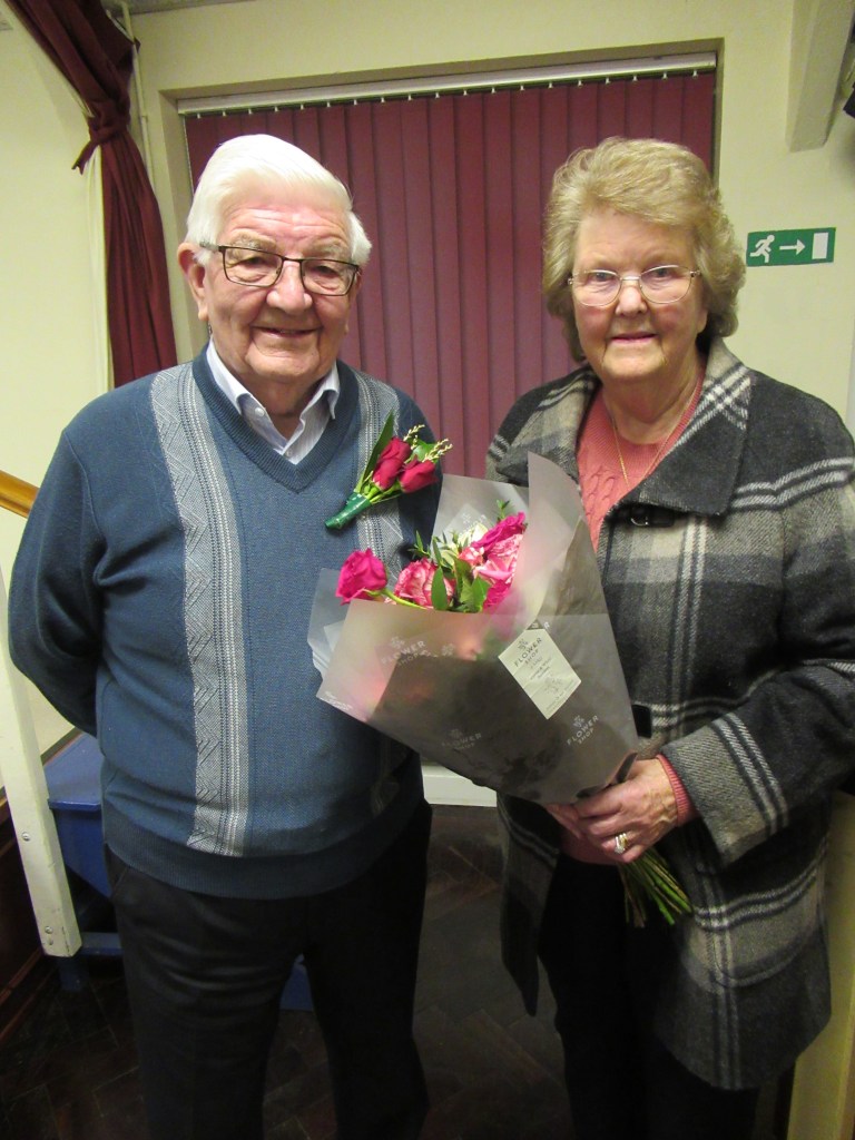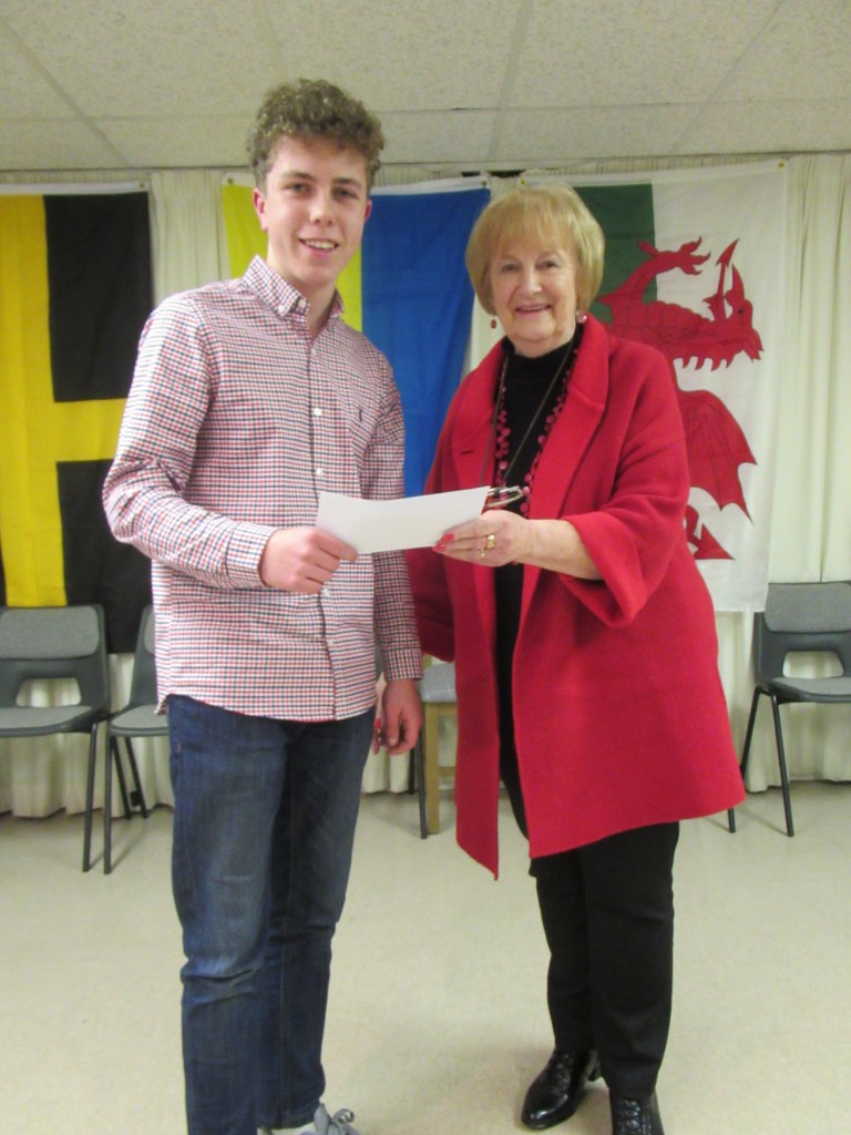 Tomos Morgan yn derbyn Ysgoloriaeth Dr. Ron a Mrs. Betty Rees i’r cystadleuydd gorau yn lleol o dan 16 oed am lefaru wrth Menna James, llywydd y prynhawn