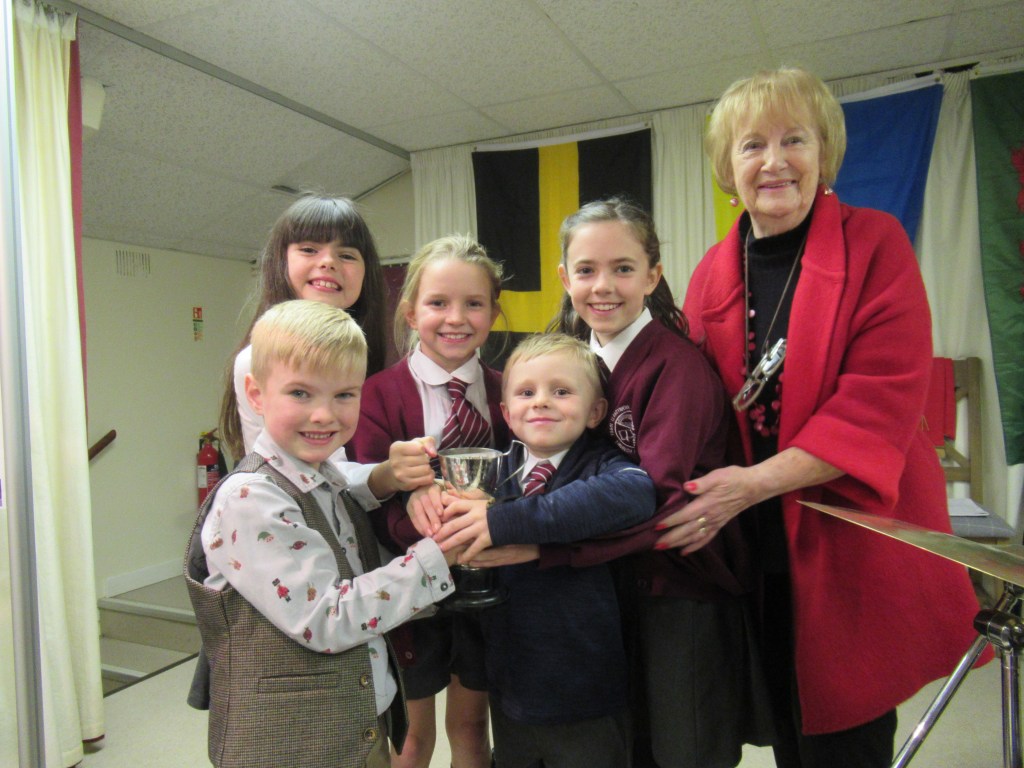 Cynrychiolwyr Ysgol Llangynnwr yn derbyn y cwpan her i’r ysgol leol uchaf ei marciau oddi wrth Menna James, llywydd y prynhawn.
