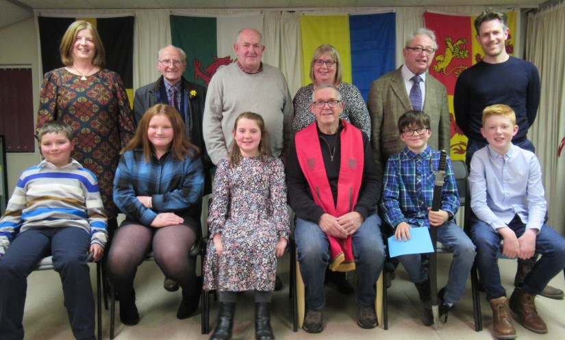 Mae’r llun yn dangos Bardd y Gadair 2022, sef Terwyn Tomos, Llandudoch a’r beirniad llên Eurig Salisbury, Aberystwyth gydag aelodau’r Orsedd.