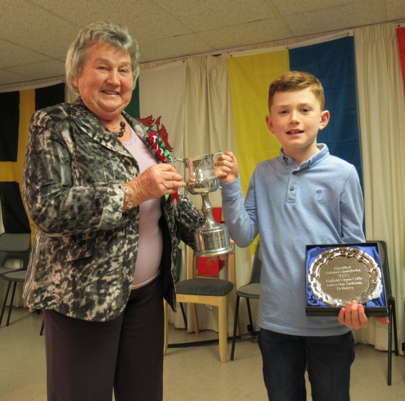 Ioan Jones o Ysgol Gwenllian yn derbyn Cwpan Coffa John a Nan Anderson, Trelimsey oddi wrth Glenys Lewis, Llywydd yr Eisteddfod am fod y cystadleuydd lleol o dan 11 oed sydd yn dangos yr addewid fwyaf